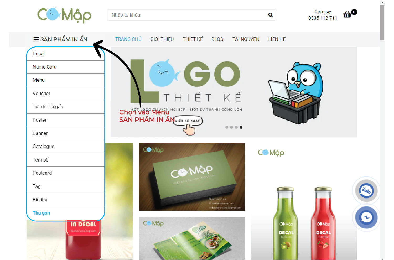Tại thanh menu SẢN PHẨM IN ẤN hãy chọn mục bạn cần.