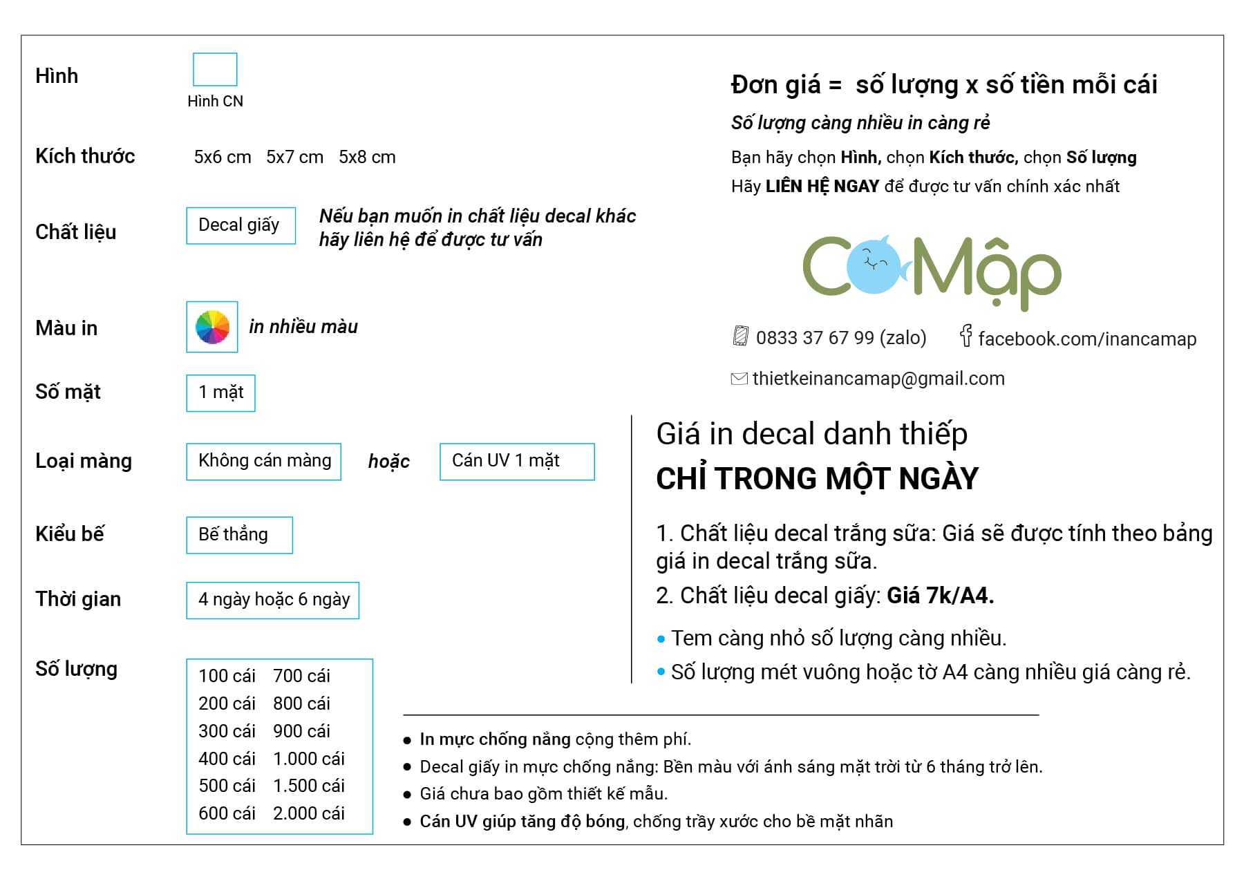 • Hỗ trợ các thiết kế và tư vấn in decal danh thiếp theo yêu cầu.