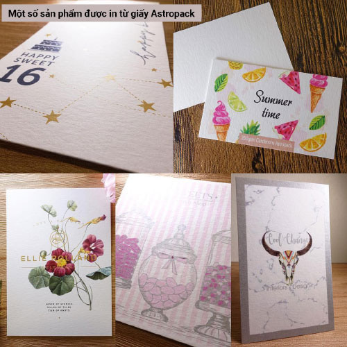 - In postcard: Giấy Astropack là một trong những lựa chọn phổ biến cho in ấn postcard. Với độ dày vừa phải và khả năng chịu mực tốt, nó cho phép tạo ra các postcard có chất lượng cao với hình ảnh sắc nét và màu sắc sống động. Điều này giúp postcard thu hút sự chú ý và gửi thông điệp rõ ràng đến người nhận.