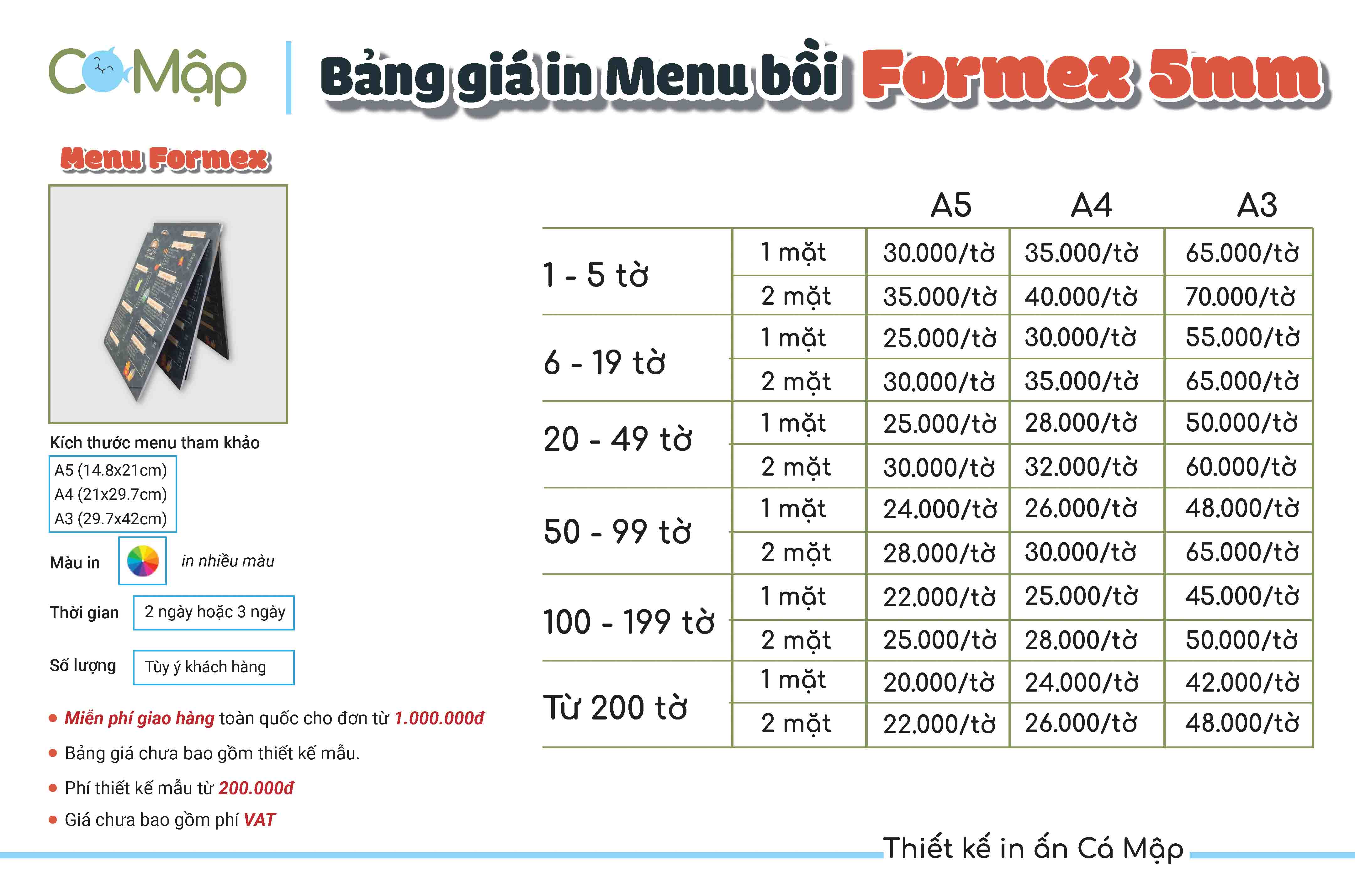 • Hỗ trợ các thiết kế và tư vấn in menu bồi formex giá rẻ theo yêu cầu.