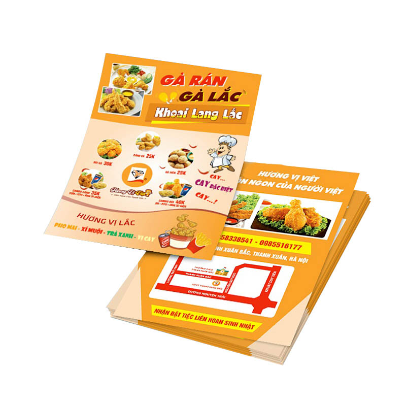 In tờ rơi là một trong những công cụ quảng cáo truyền thống nhưng vẫn hiệu quả cho các chiến dịch quảng cáo địa phương. Tờ rơi được phát hành và phân phối trực tiếp tới đối tượng khách hàng tiềm năng, giúp tăng khả năng nhận thức về thương hiệu và sản phẩm của bạn.