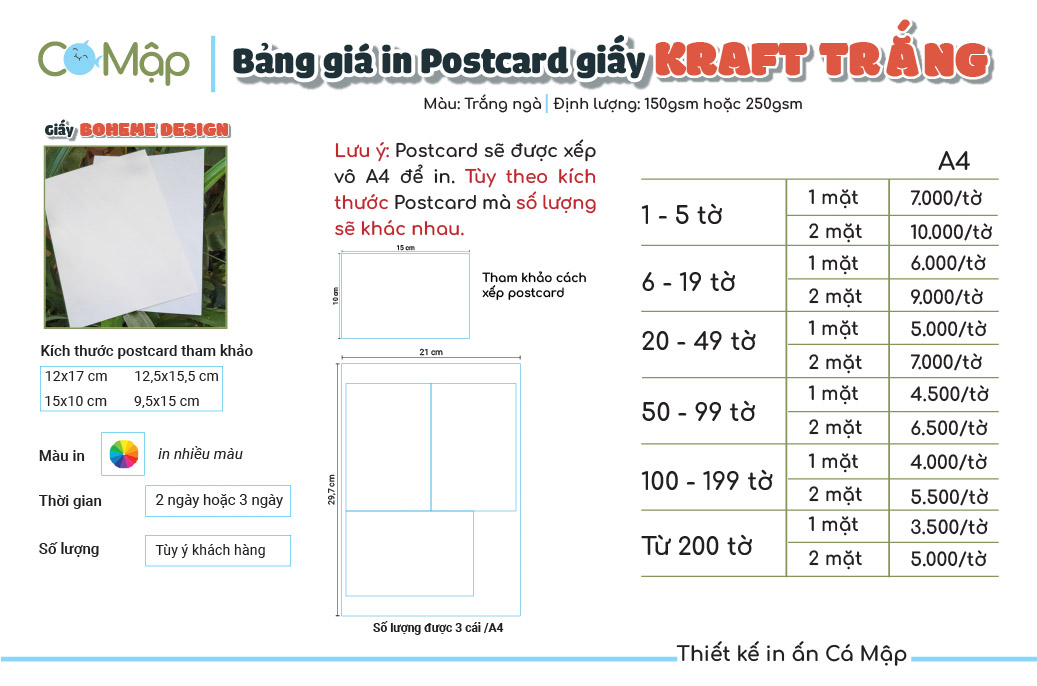 Ngoài ra, postcard cũng có thể được in trên các loại giấy khác như giấy kraft, giấy in ảnh, giấy bìa cứng,... Tùy thuộc vào mục đích sử dụng và sở thích của người dùng, bạn có thể lựa chọn loại giấy in phù hợp.