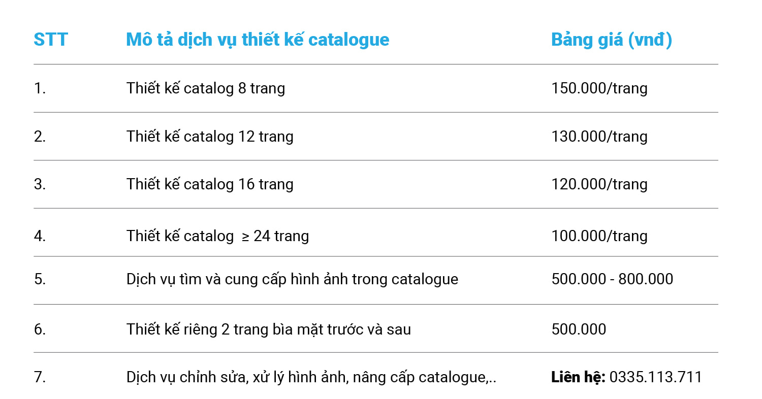 - Báo giá trên dành cho catalogue thông thường. Các catalogue yêu cầu xử lý hình ảnh nhiều, hoặc chưa có nội dung rõ ràng và các catalogue đặc biệt sẽ có báo giá cao hơn khoảng 20% giá hiện tại.