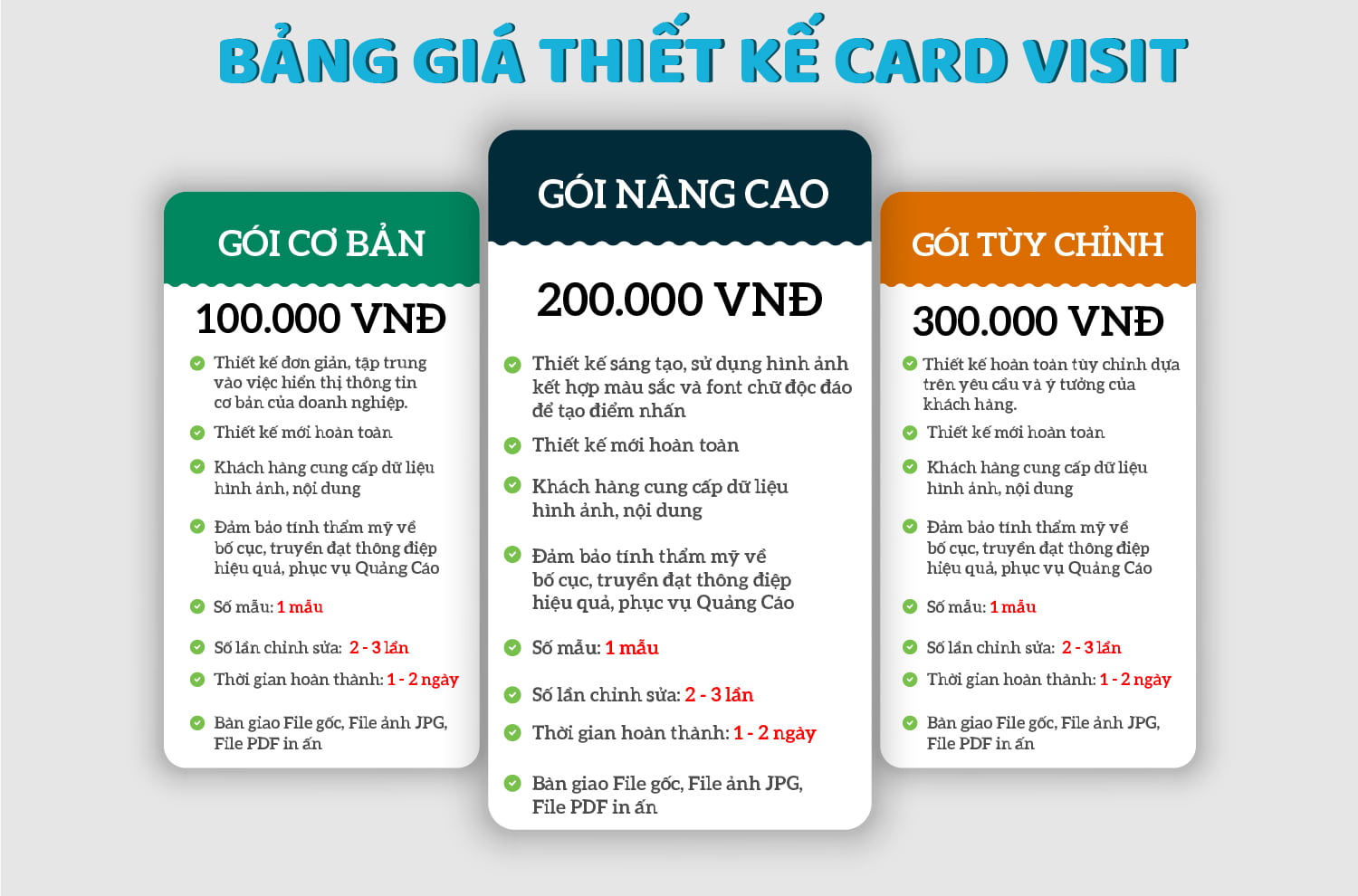 Một bảng giá rõ ràng và minh bạch là yếu tố quan trọng trong quyết định của khách hàng khi tìm kiếm dịch vụ thiết kế card visit. Điều này giúp khách hàng có cái nhìn tổng quan về các gói dịch vụ và mức giá tương ứng. Với bảng giá thiết kế card visit chúng tôi cung cấp, bạn sẽ dễ dàng tìm hiểu về các lựa chọn và có thể đưa ra quyết định thông minh dựa trên ngân sách và nhu cầu của mình.