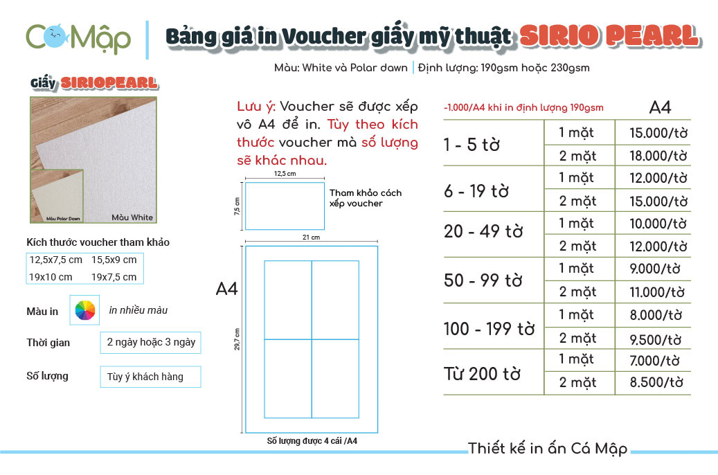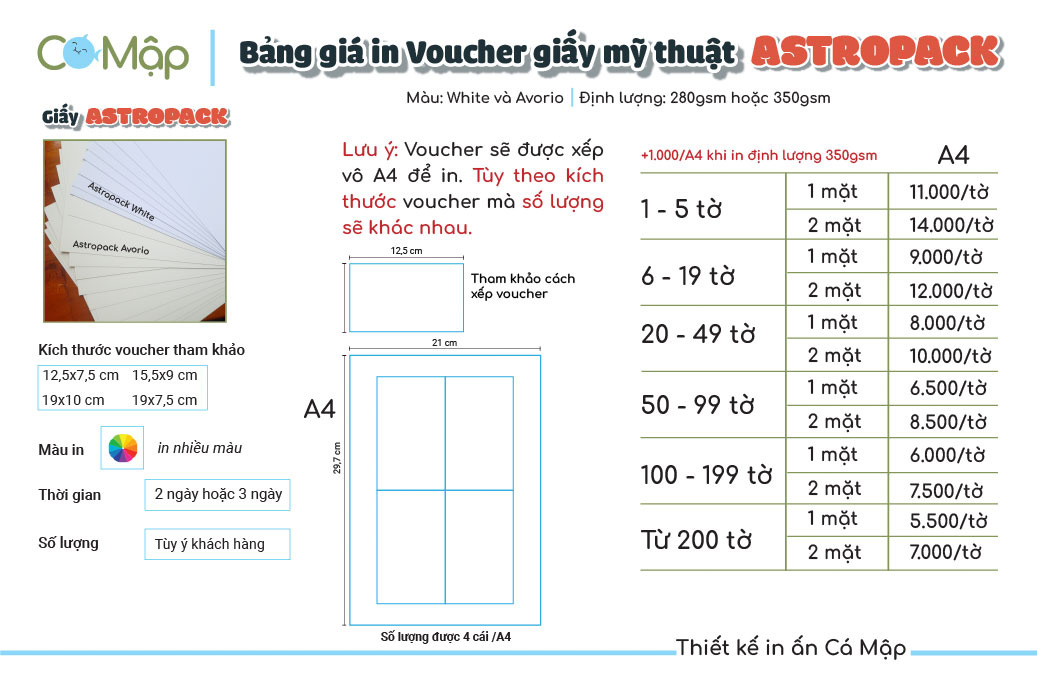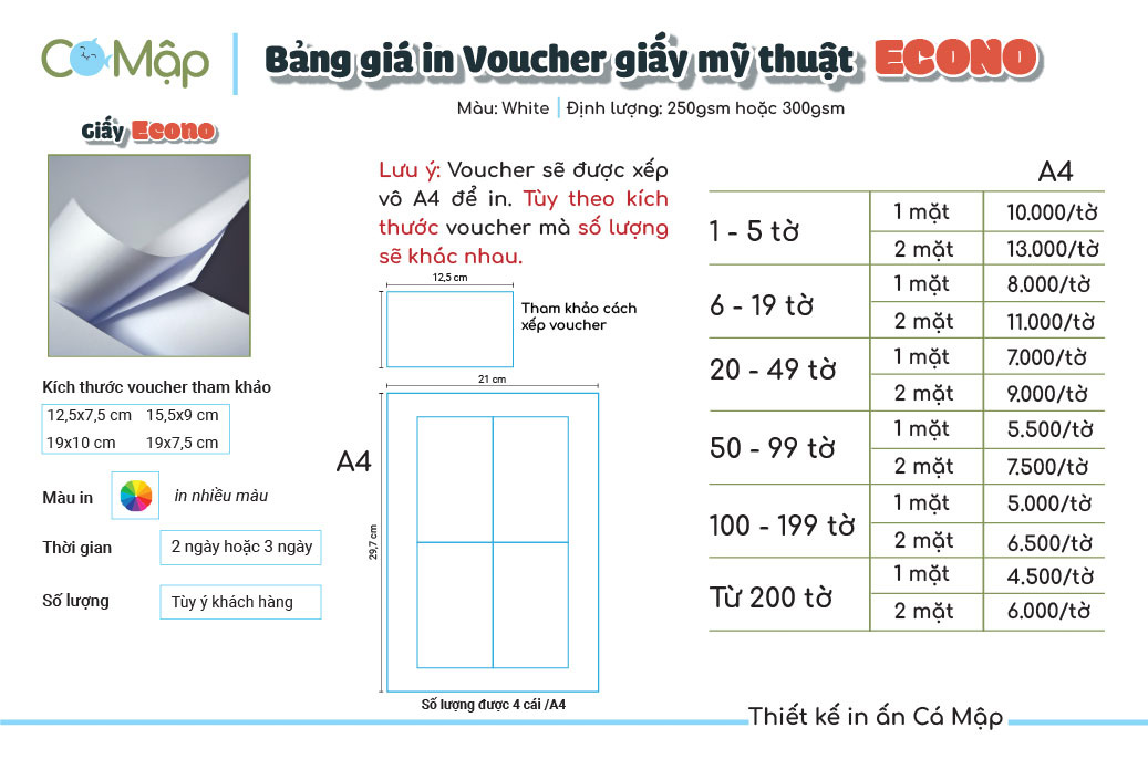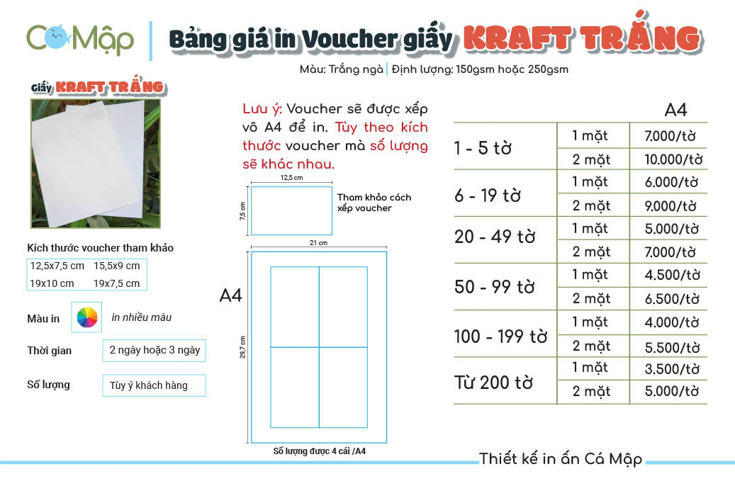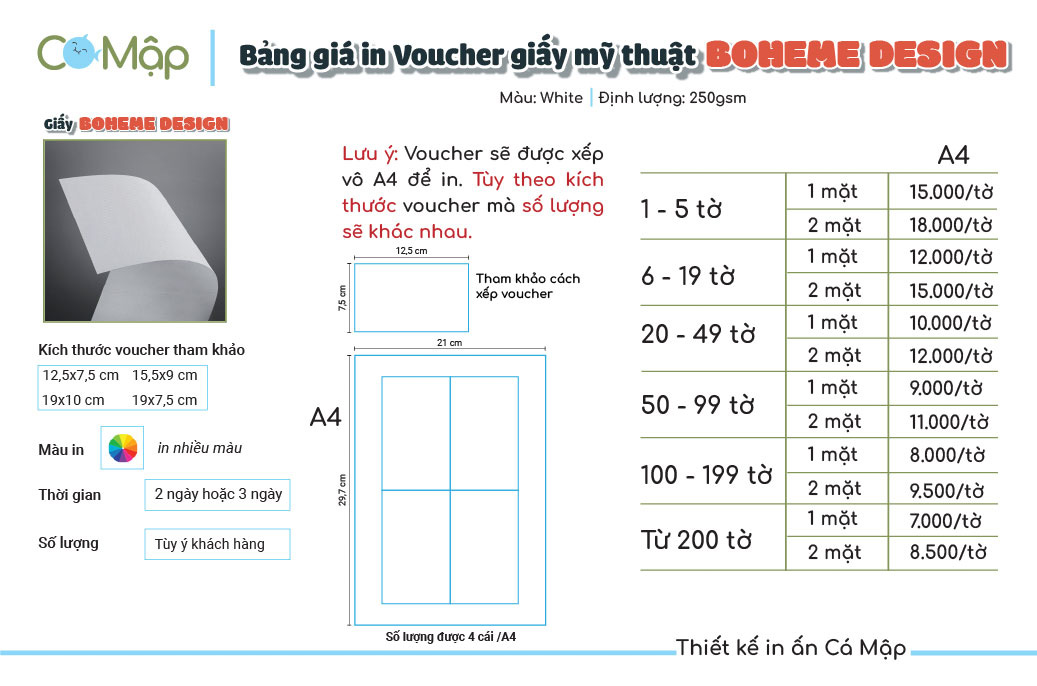 Bảng giá in voucher của Cá Mập phụ thuộc vào loại giấy mỹ thuật, số lượng in và yêu cầu thiết kế của khách hàng. Để được tư vấn cụ thể về giá, vui lòng liên hệ với Cá Mập qua